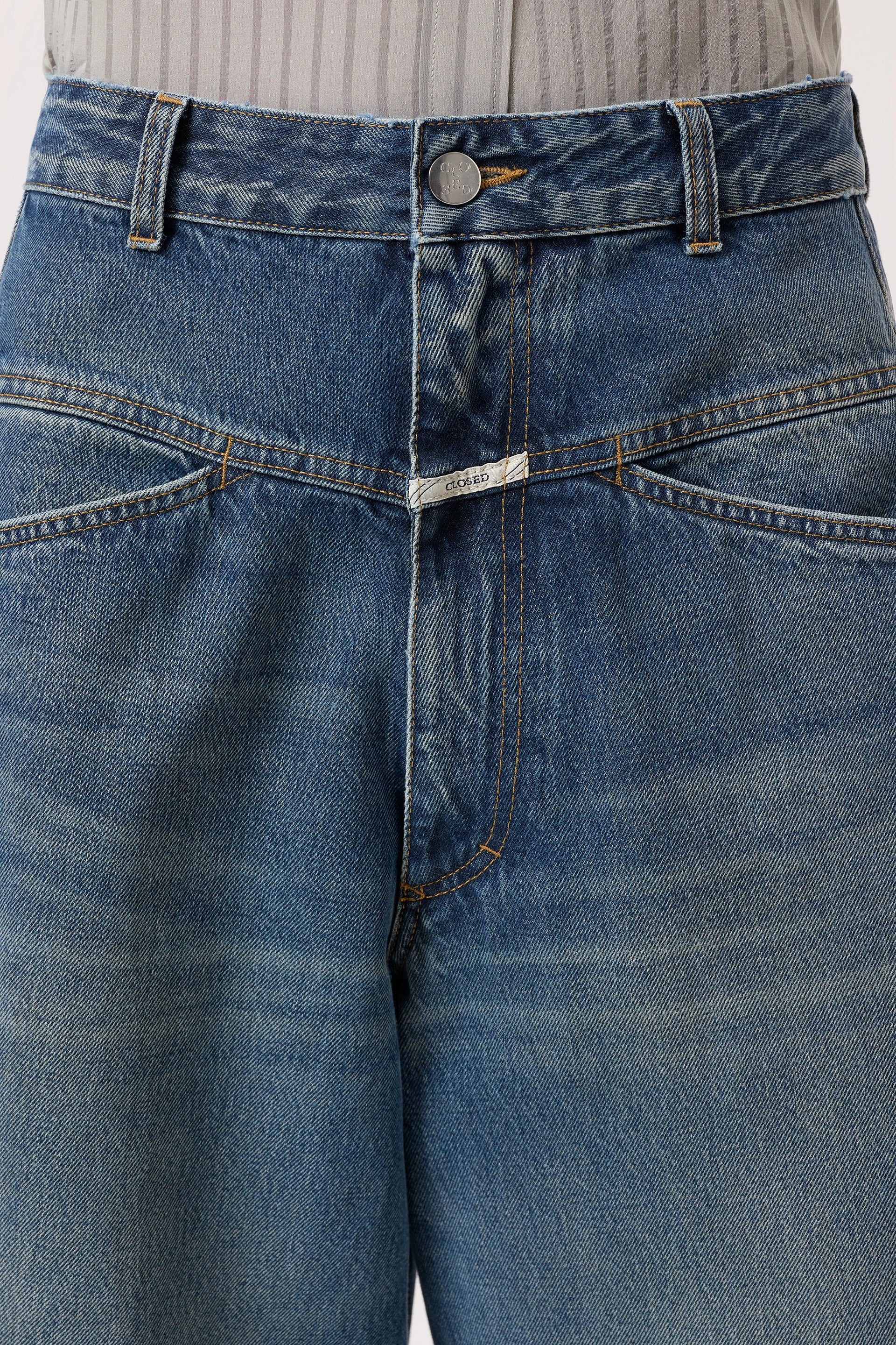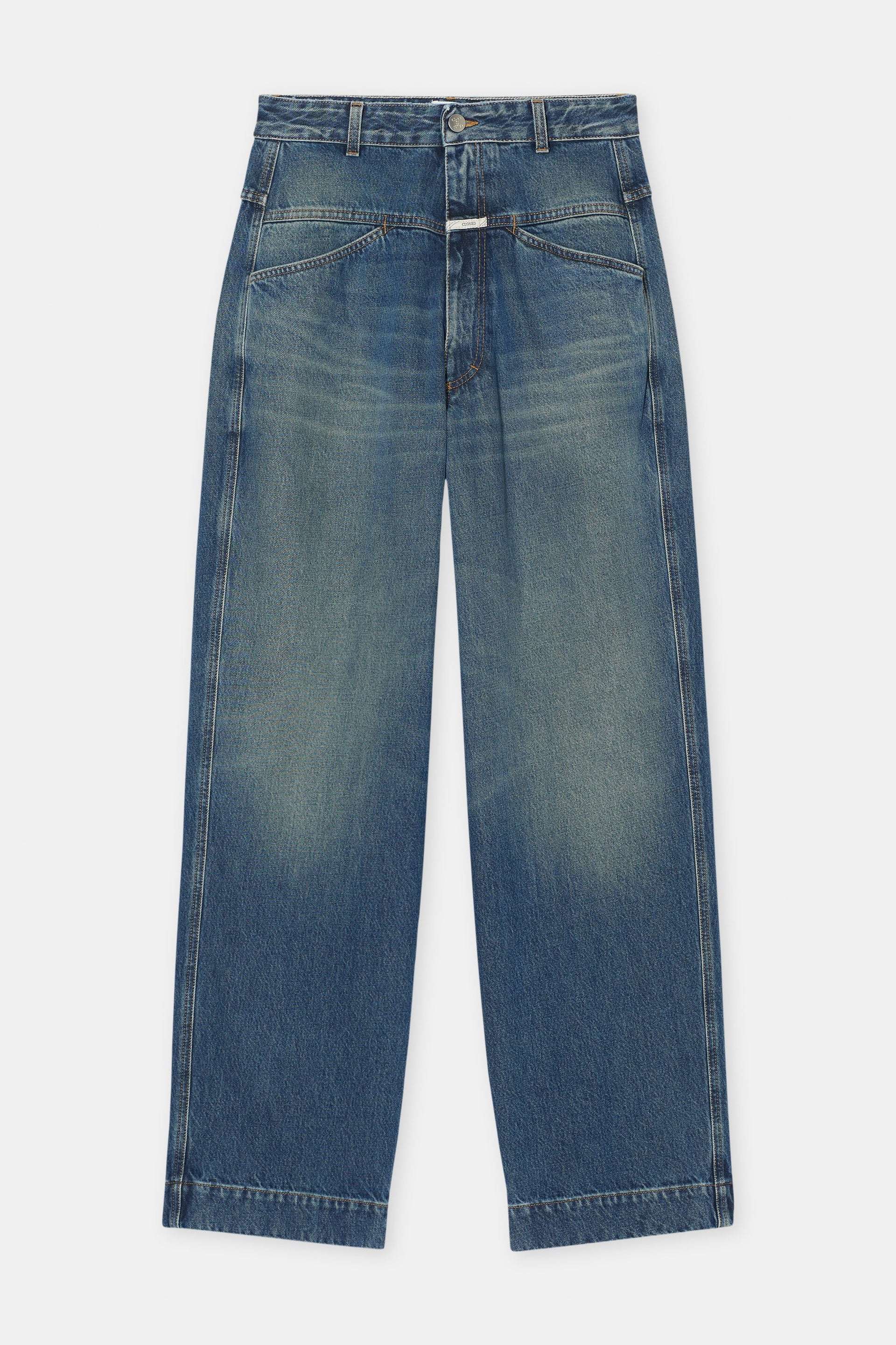 Our Deni-X is inspired by our Closed Archive: the loose fit is characterized by a deep instep with extended waistband, large back pockets and extra long legs for a relaxed, baggy look. Made in Italy from authentic blue denim (100% regenerative cotton) with used wash and salt and pepper finish in the style of the 80s.