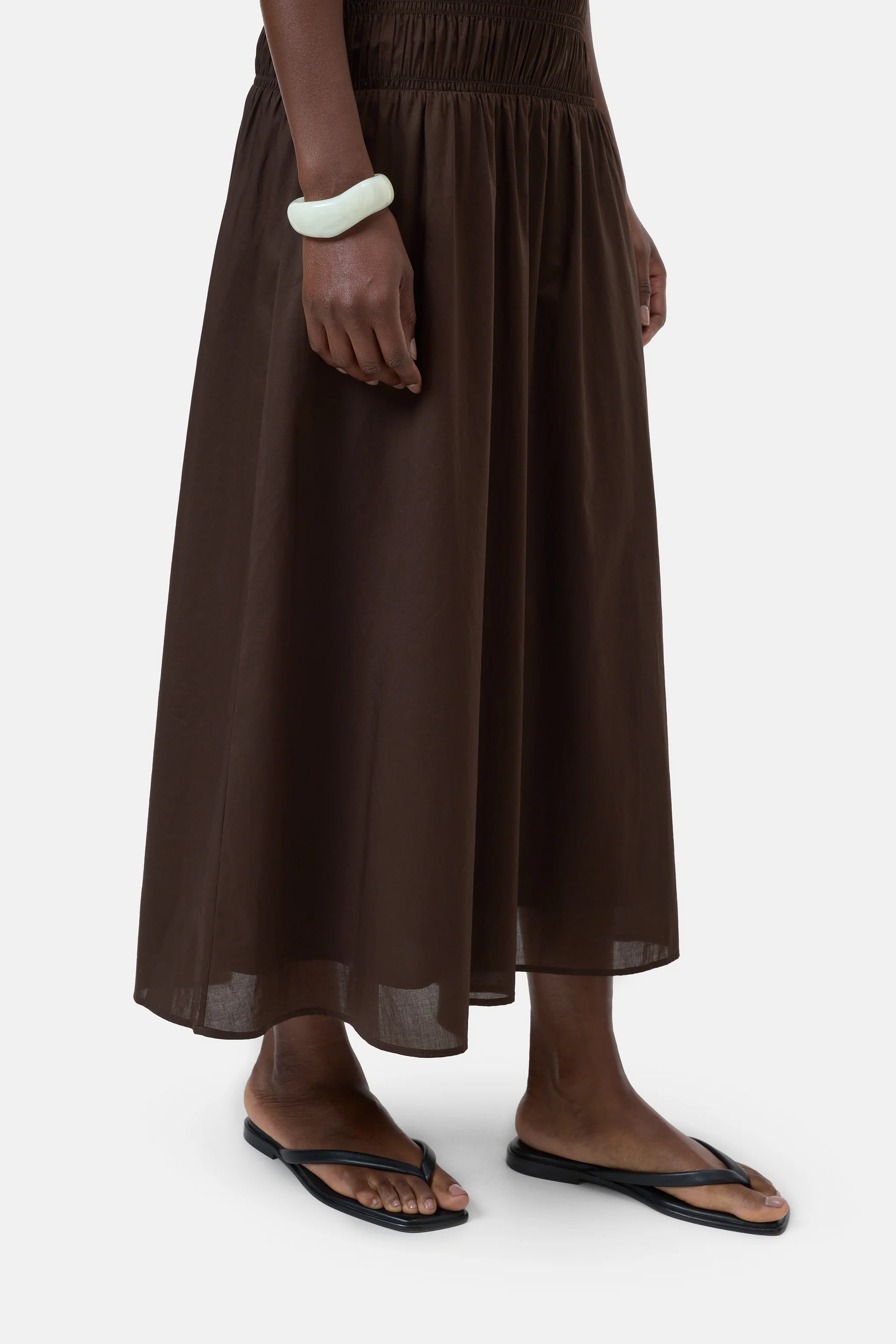 Long dress made from high-quality cotton with a low waistband. The top features striking smocked details that create a slim fit, complemented by a round neckline and fitted sleeves. The skirt is fully lined.