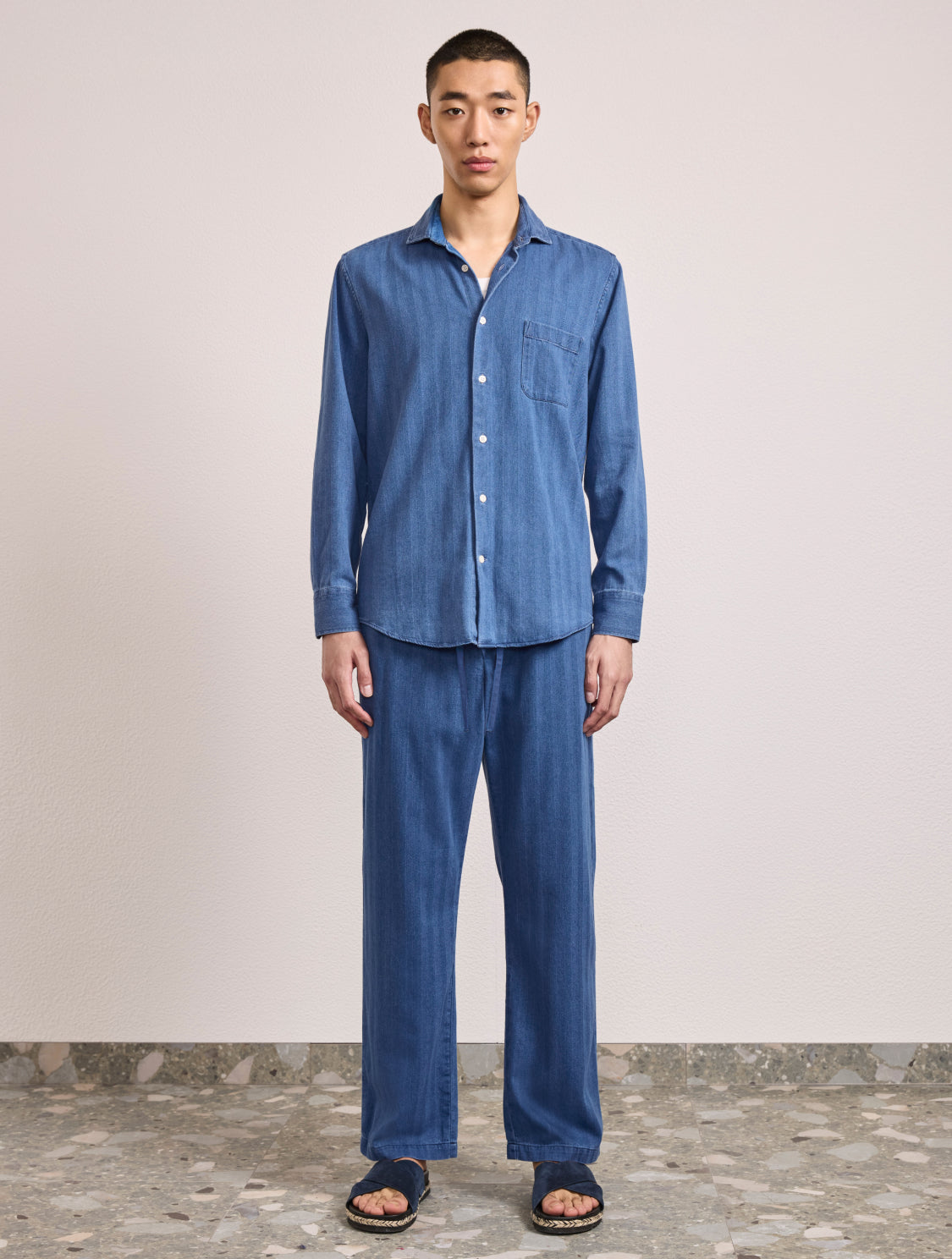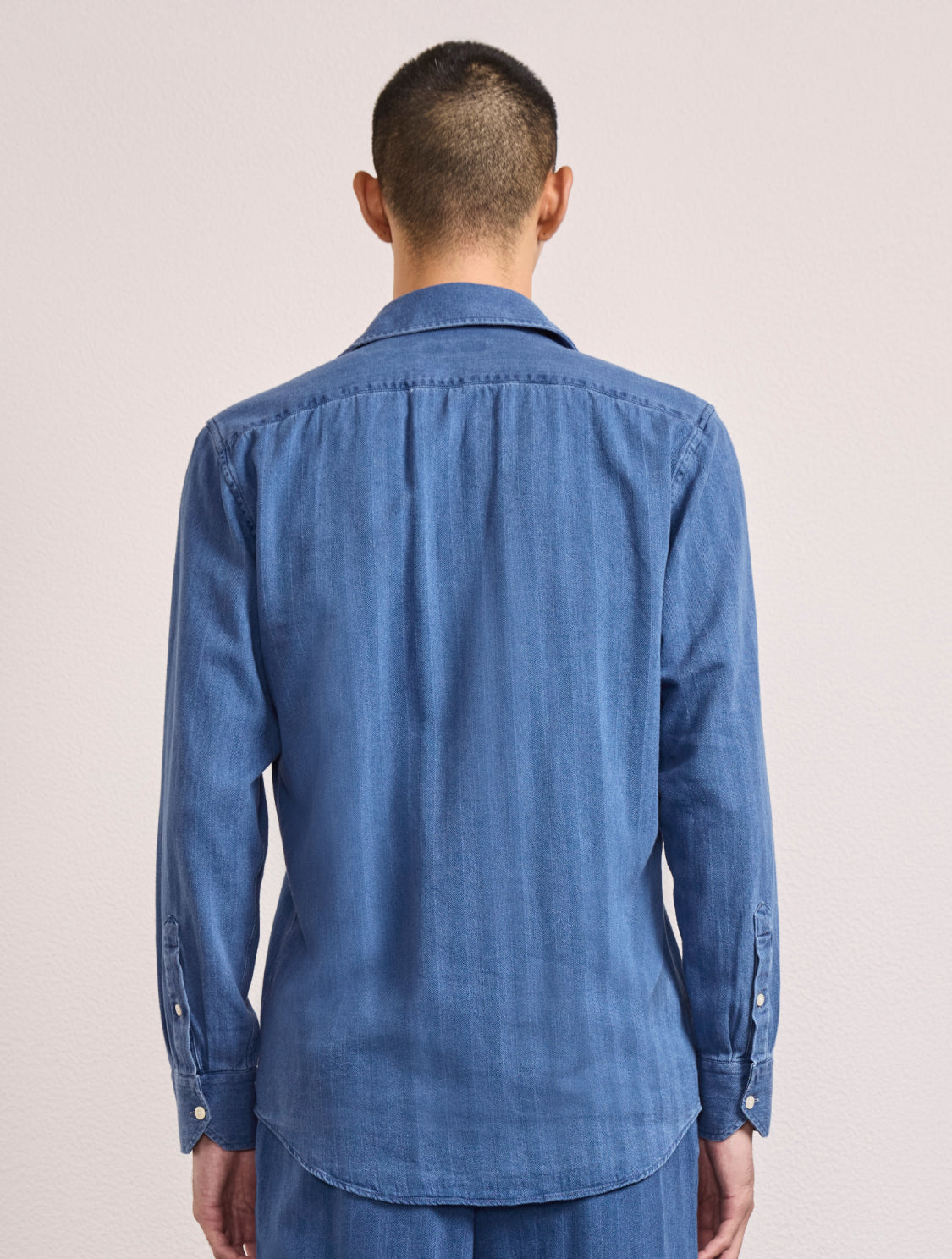 Emilio is our herringbone cotton shirt designed to look like denim. Woven for a twill structure, this long-sleeved shirt offers an inimitably soft hand-feel.