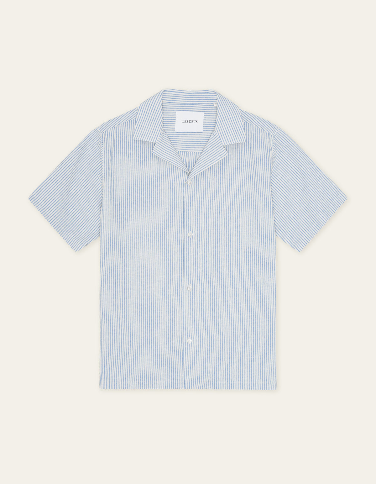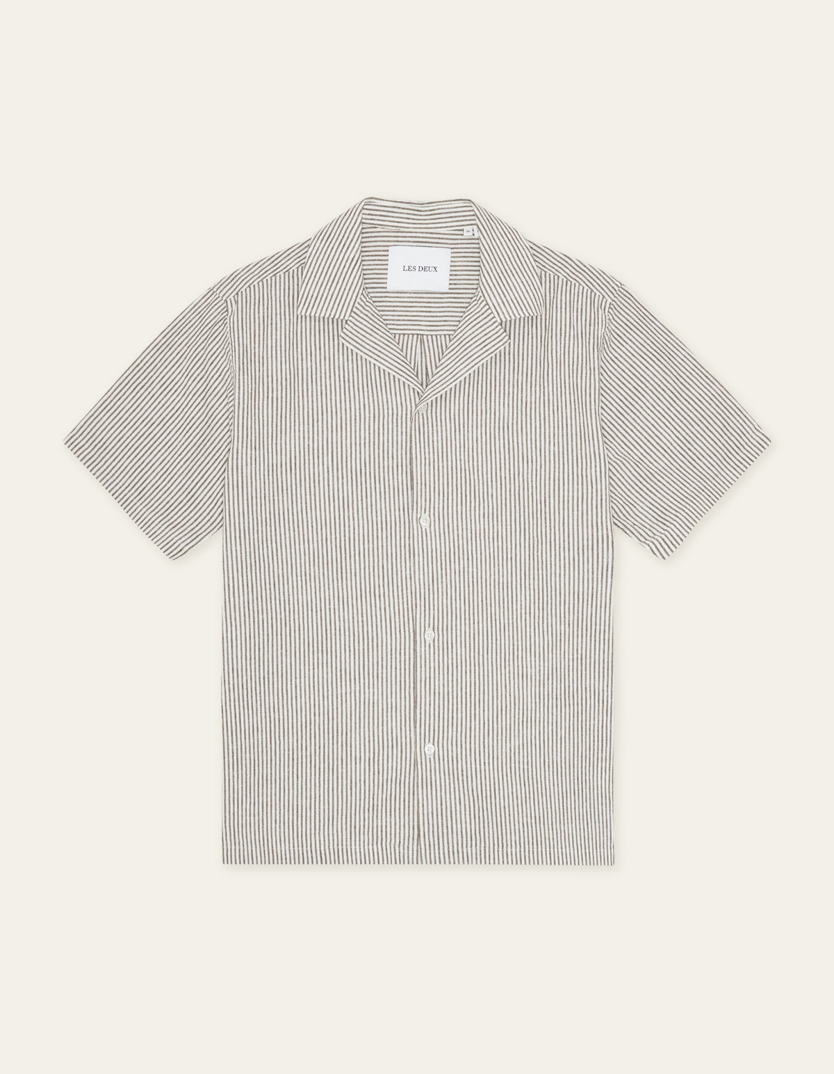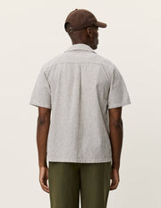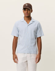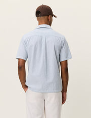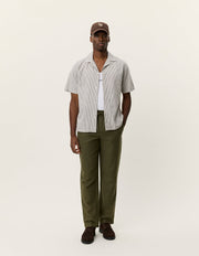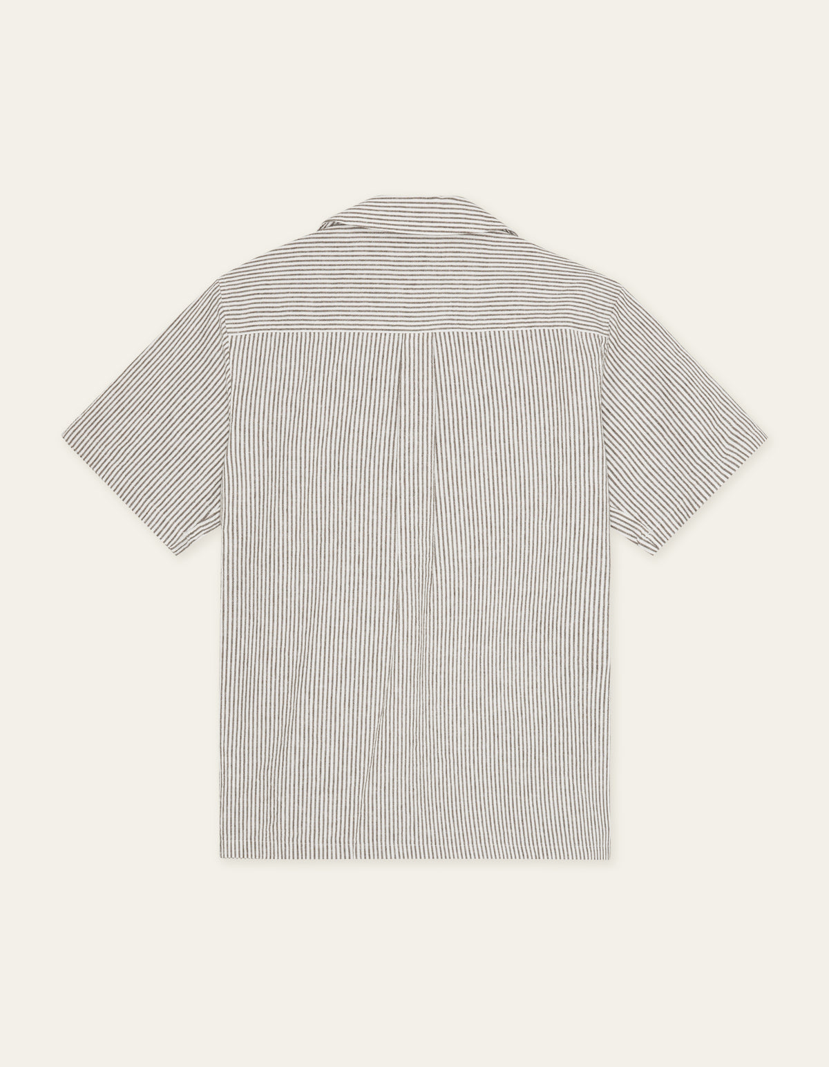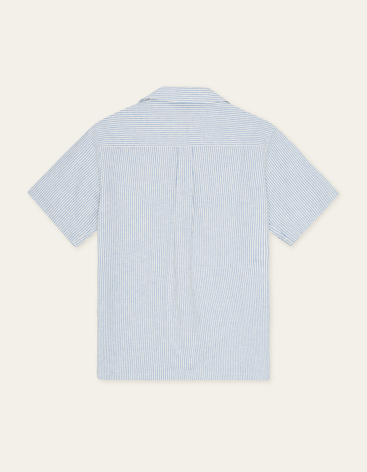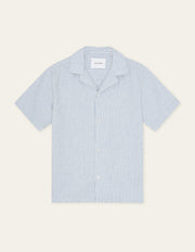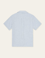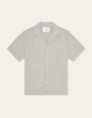 A lightweight short sleeve shirt in a breathable cotton–linen blend with a classic vertical stripe. Finished with a relaxed camp collar and a clean, easy drape.