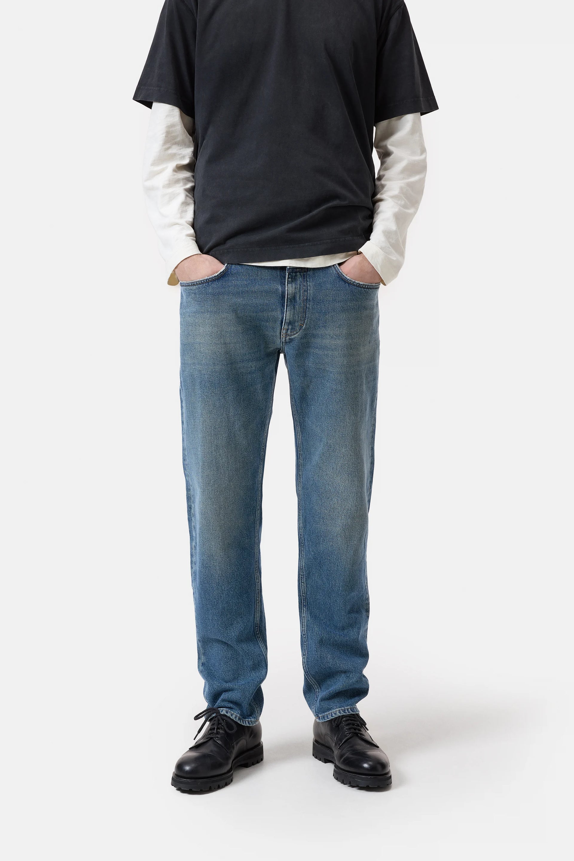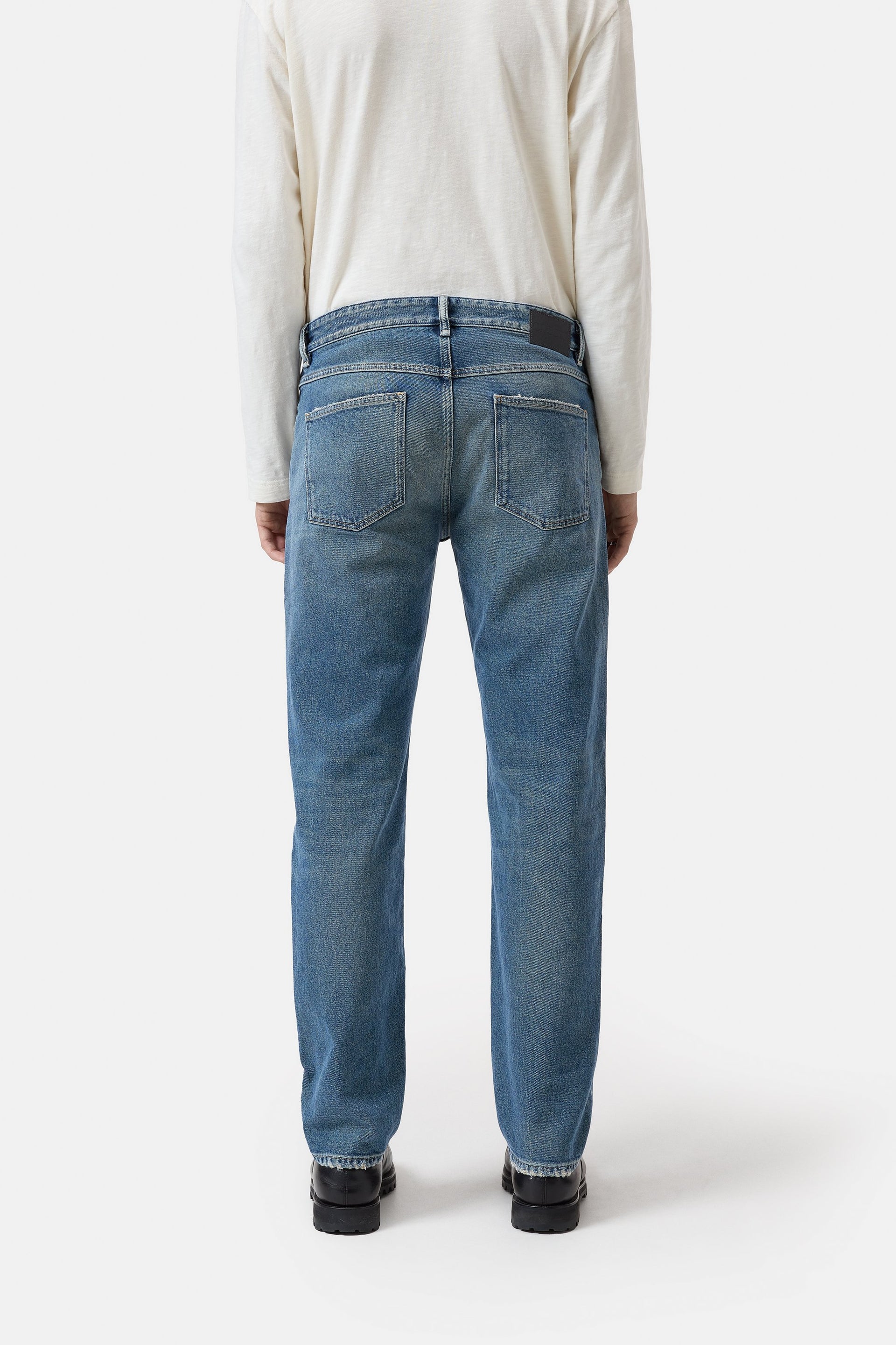 Our regular-fit mid-waist, straight leg 5-pocket jeans are crafted from mid-blue stretch denim (12 oz.) with handcrafted details and subtle abrasion marks for an authentic look. Made in Italy with 20% recycled cotton and pre-reduced indigo.
