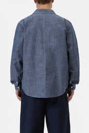 The cotton chambray shirt offers a regular fit with heritage-inspired details. The fabric undergoes a careful rinse wash process, preserving its natural character whilst creating a softened feel. Ddesign elements include an archive worker chest pocket with flap closure, mother-of-pearl buttons, and pronounced contrast stitching.