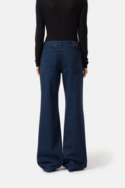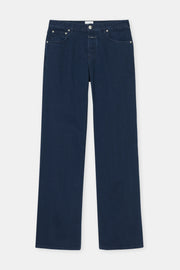 Our 5-pocket jeans Gillan in a wide fit feature a low rise and long, wide legs. They’re made from Italian denim with dark indigo warp and grey weft, resulting in a special structure. Finished with button fly. Produced in Italy using regenerative cotton and innovative dyeing methods.