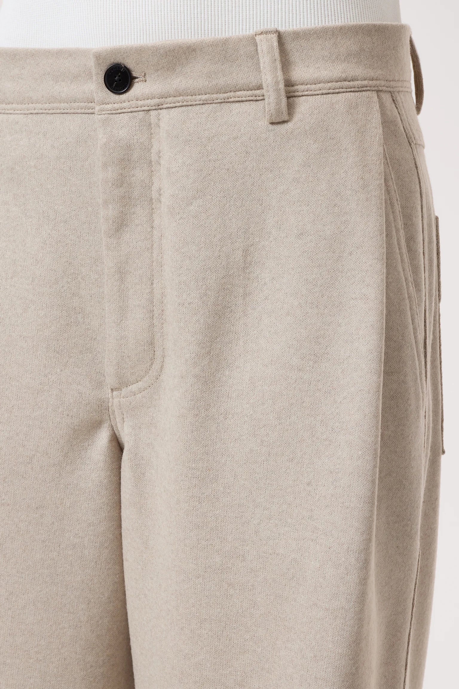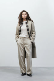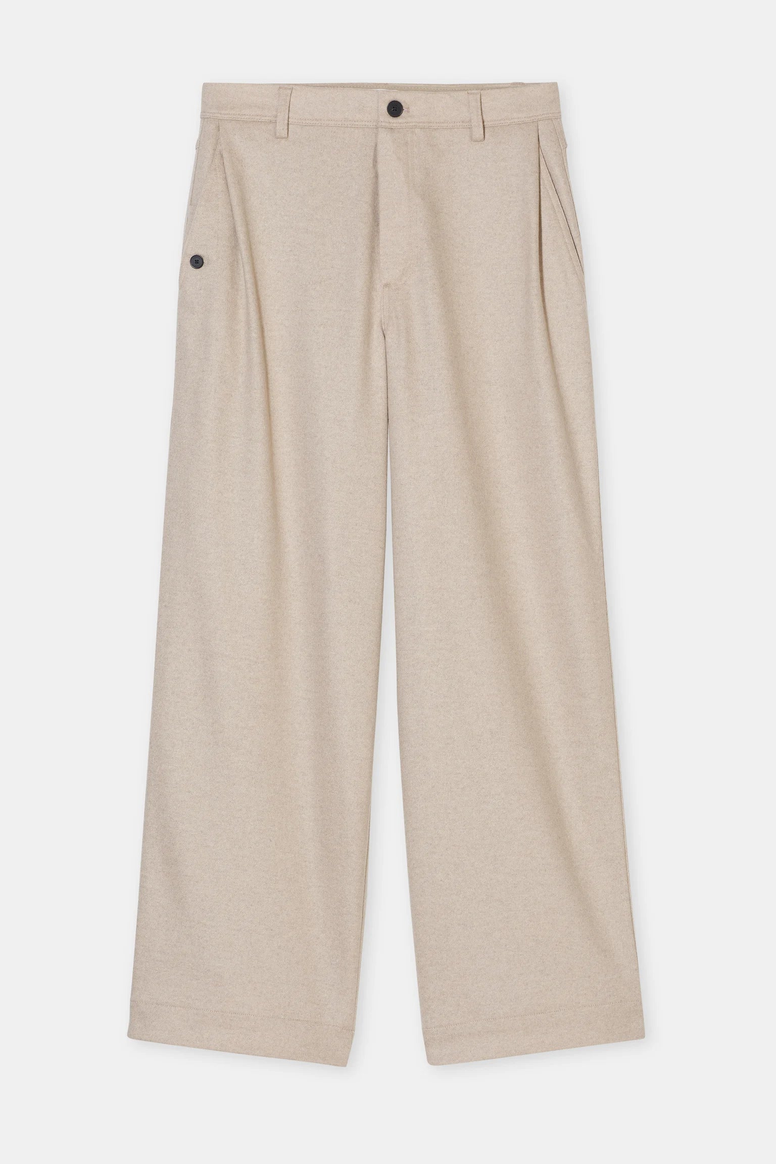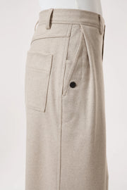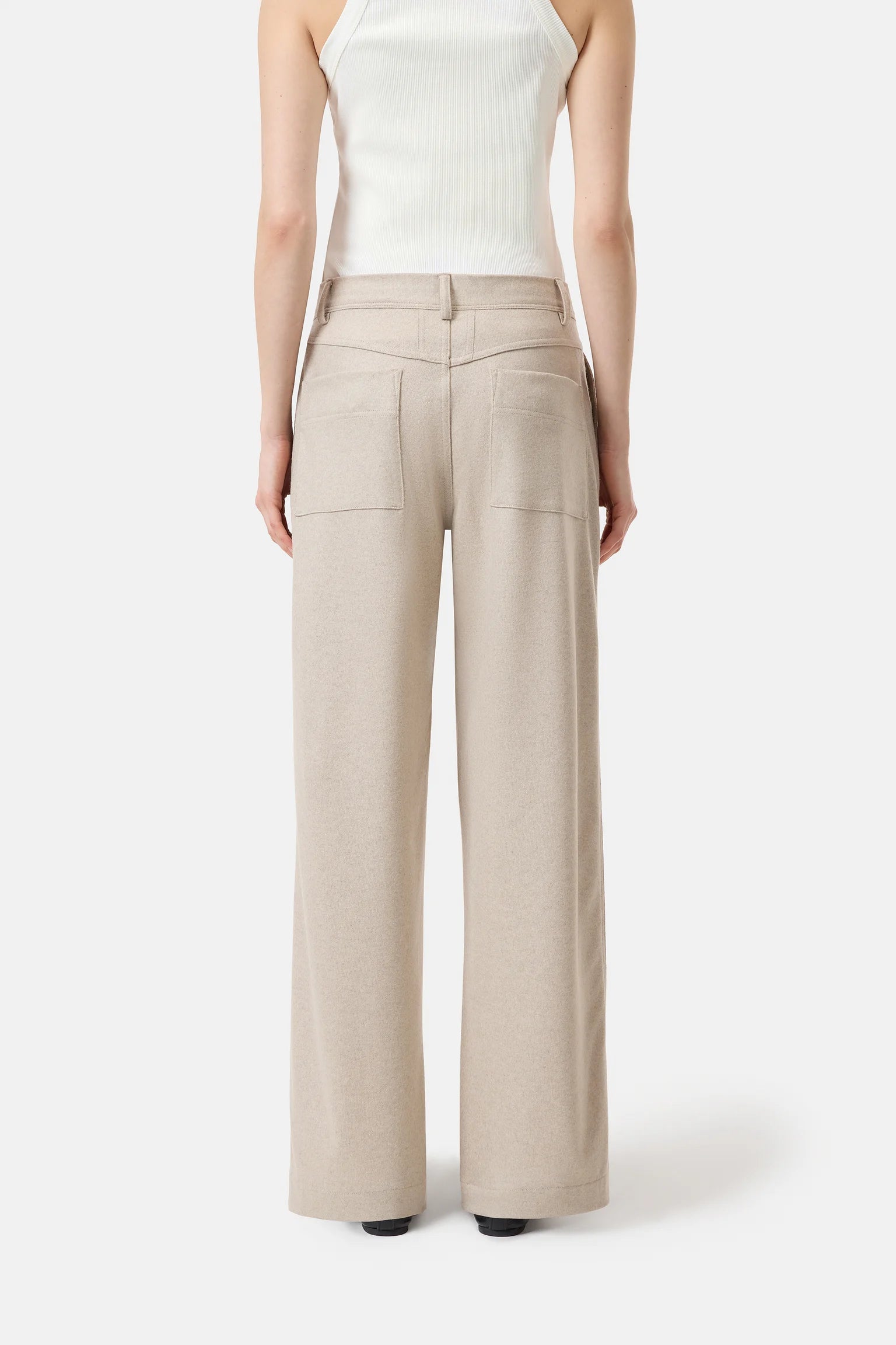 Our Wrenna pants offer a wide fit with a medium waist. Made from soft wool jersey with a clean finish, it comes with a distinctive waistband with a special side pocket construction, decorative stitching on the back pockets and dark buttons. Made of 100% recycled wool.