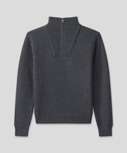 The zip-neck trucker sweater, knitted from merino wool, is inspired by vintage ski sweaters. It offers a clean silhouette while ensuring natural stretch and optimal comfort. Featuring the two discrete black-lacquered RD eyelets on the side.
