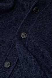 This V-neck cardigan is made of a twine of two different yarns: wool yarn and a bouclé yarn of cotton. This combination ensures a lively surface. Collar, cuffs and hem are ribbed.