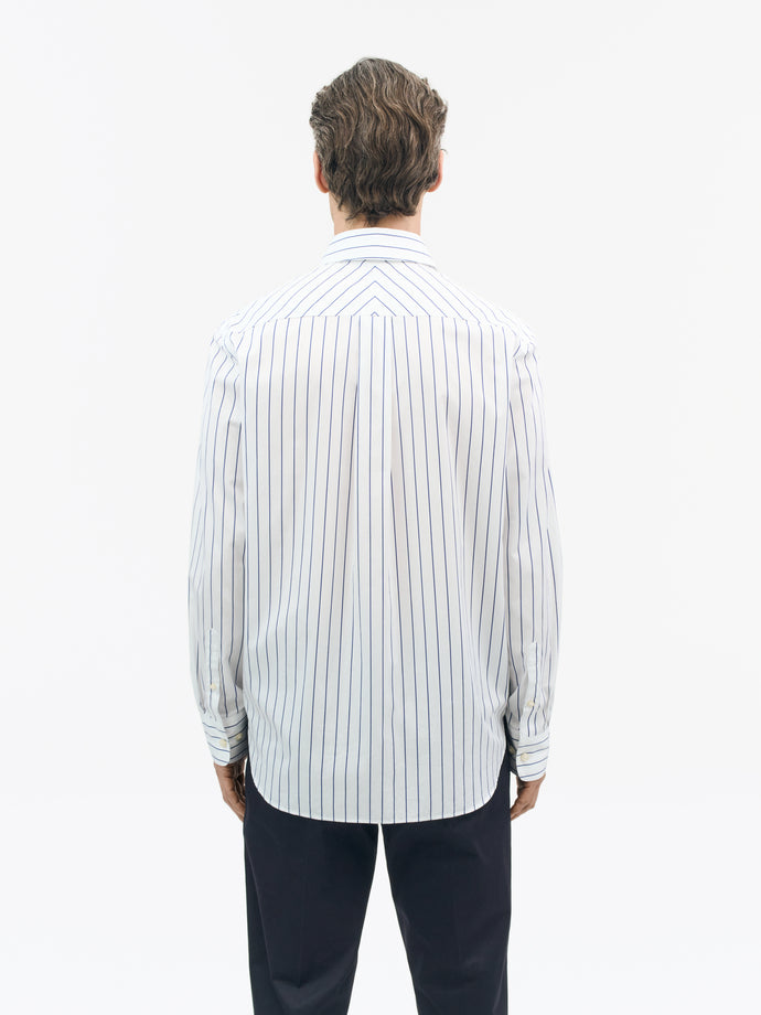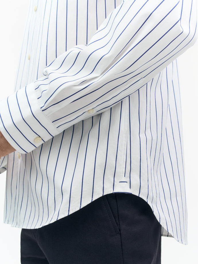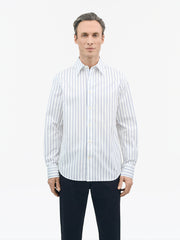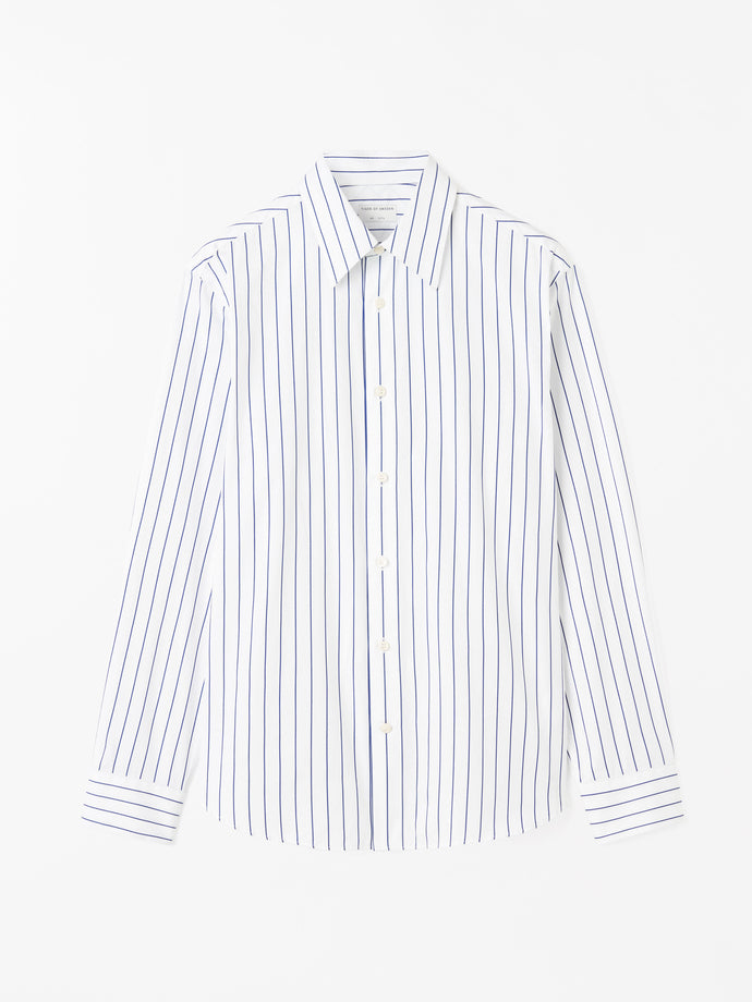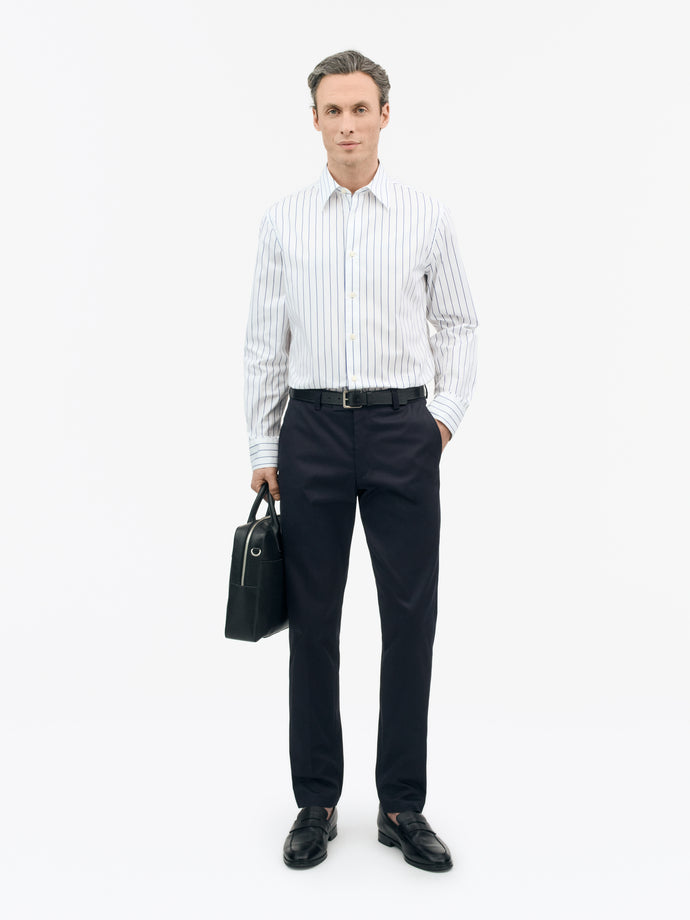 Bennett is a formal, pointed collar shirt made from cotton stripe fabric. It features a slightly wider classic placket and rounded cuffs with double buttons for size adjustment.