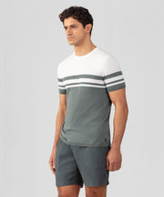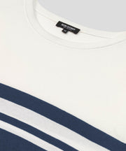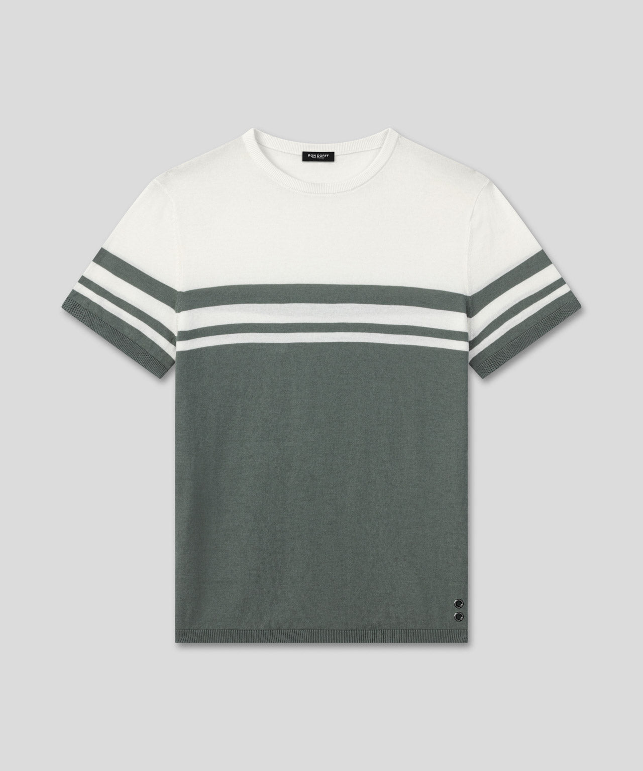 The classic RON DORFF bicolor knitted cotton t-shirt. Upgraded in 100% premium cotton for guaranteed breathability and comfort. Designed with a slightly tapered fit. Crew neck and ribbed collar. Pre-washed for minimum shrinkage. Featuring the double black-lacquered RD signature eyelets.