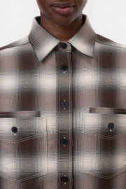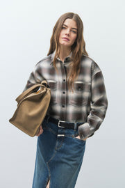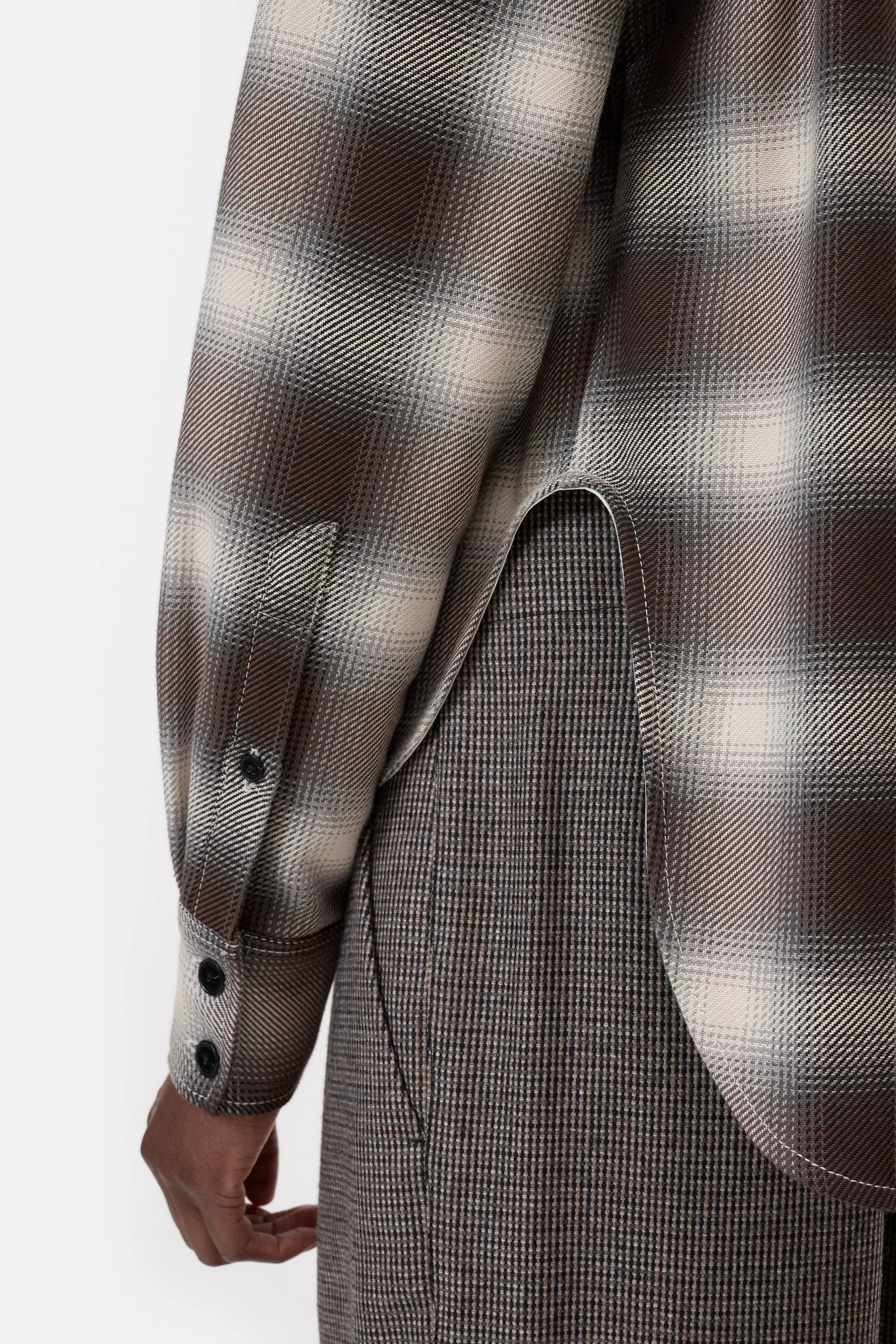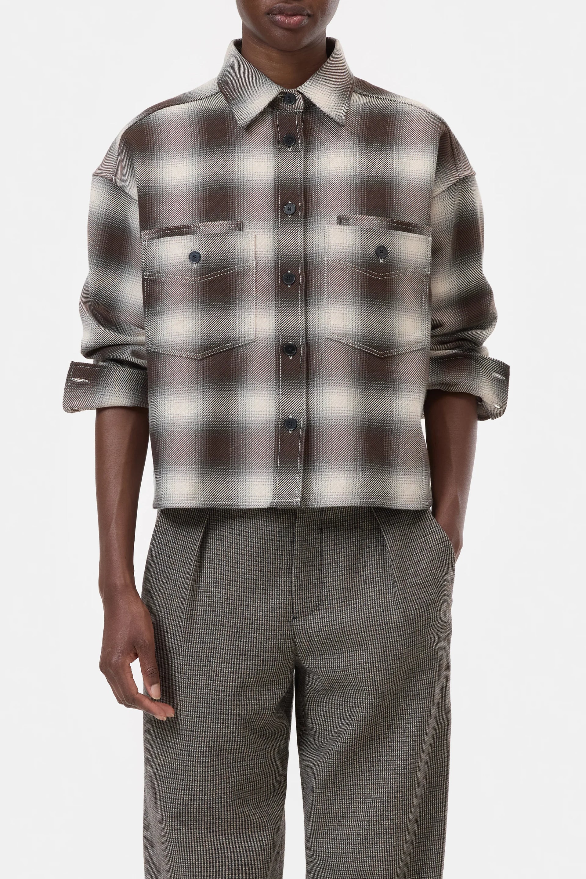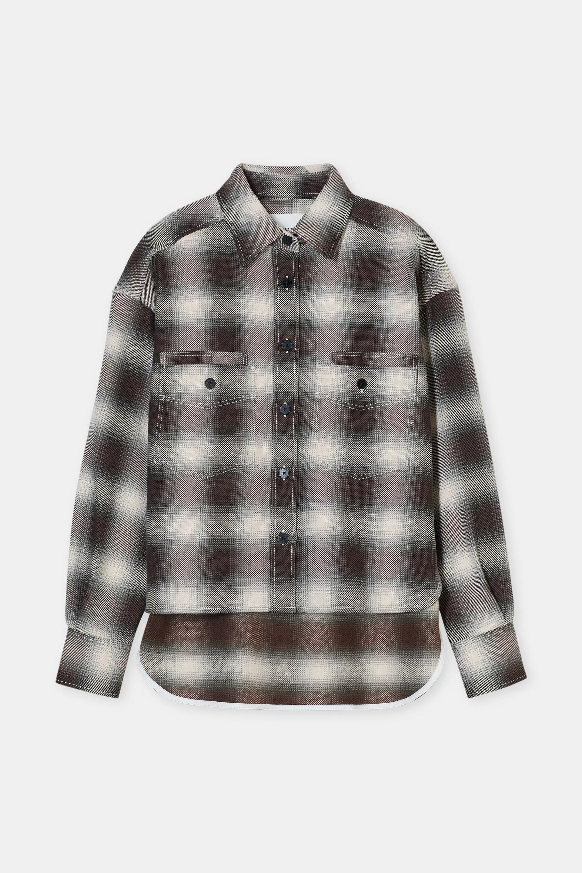 This oversized cut shirt with a shortened length has a shadow check pattern. Made of brushed cotton, it comes with a curved high-low-bottom hem, chest pockets with mother-of-pearl buttons, pointed collar and dropped shoulders. Made in Portugal.