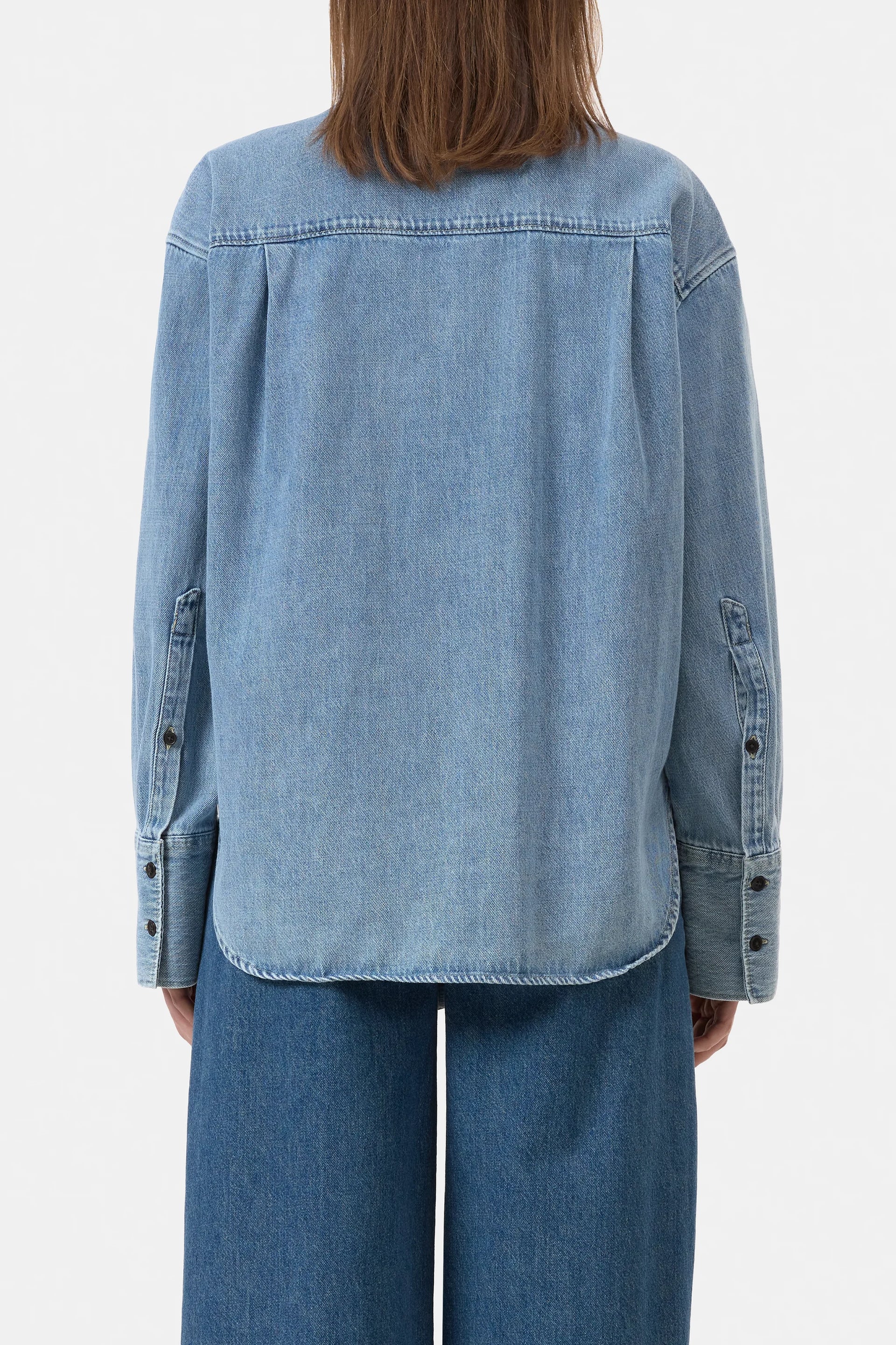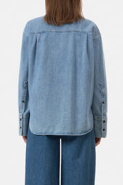This blouse in high-quality denim has a scarf detail at the neck. It has diagonal chest pockets and adjustable cuffs for different sleeve styling. Made in Portugal from organic and recycled cotton.