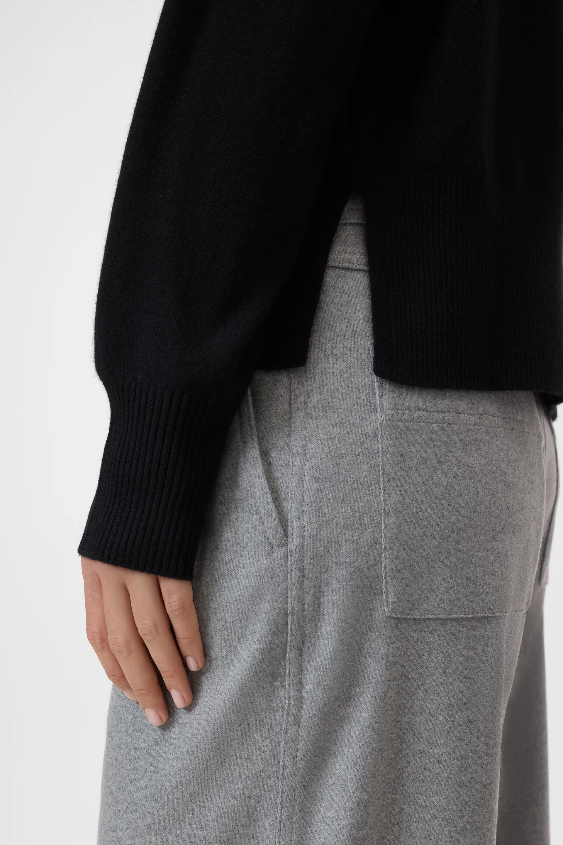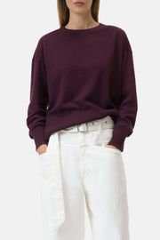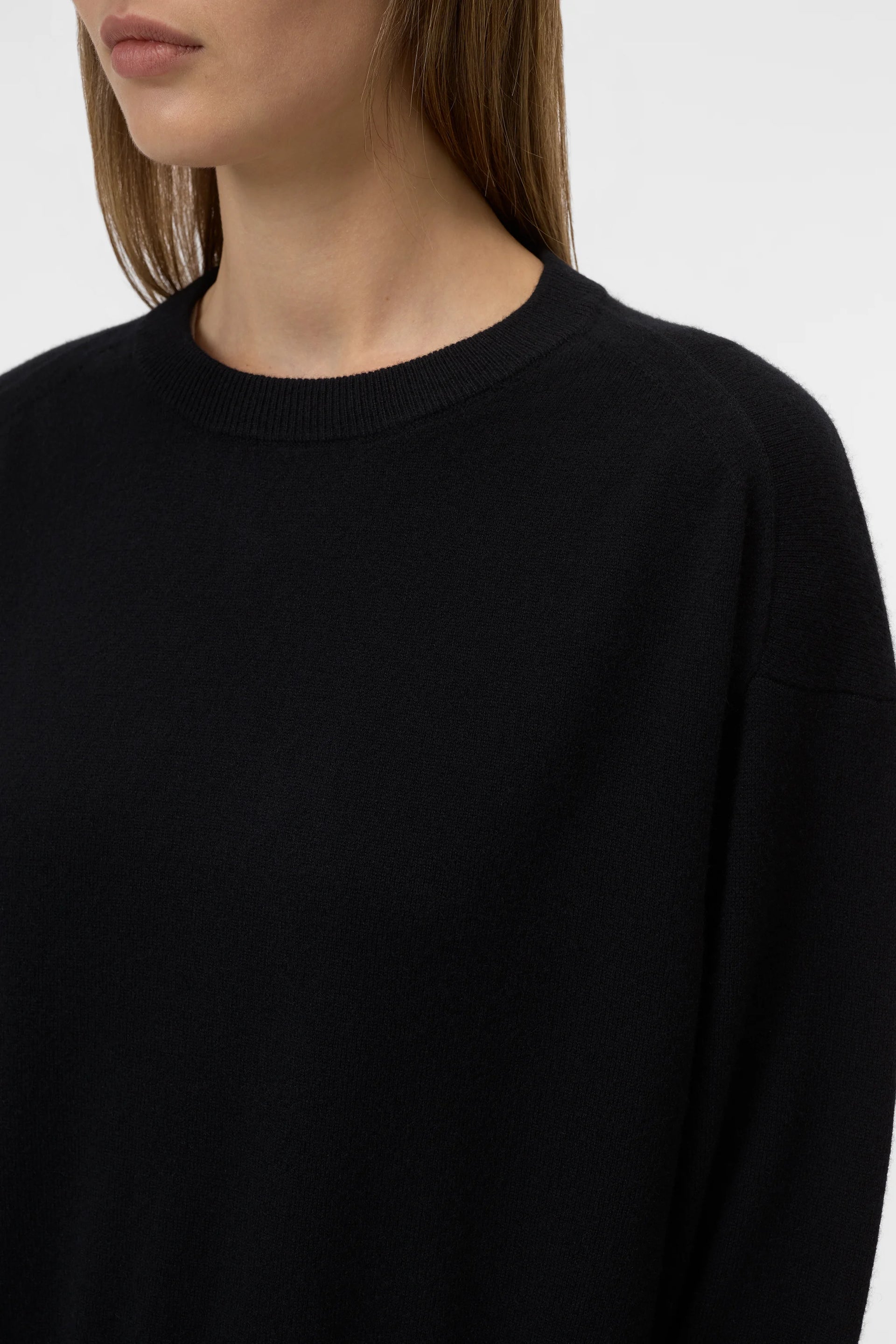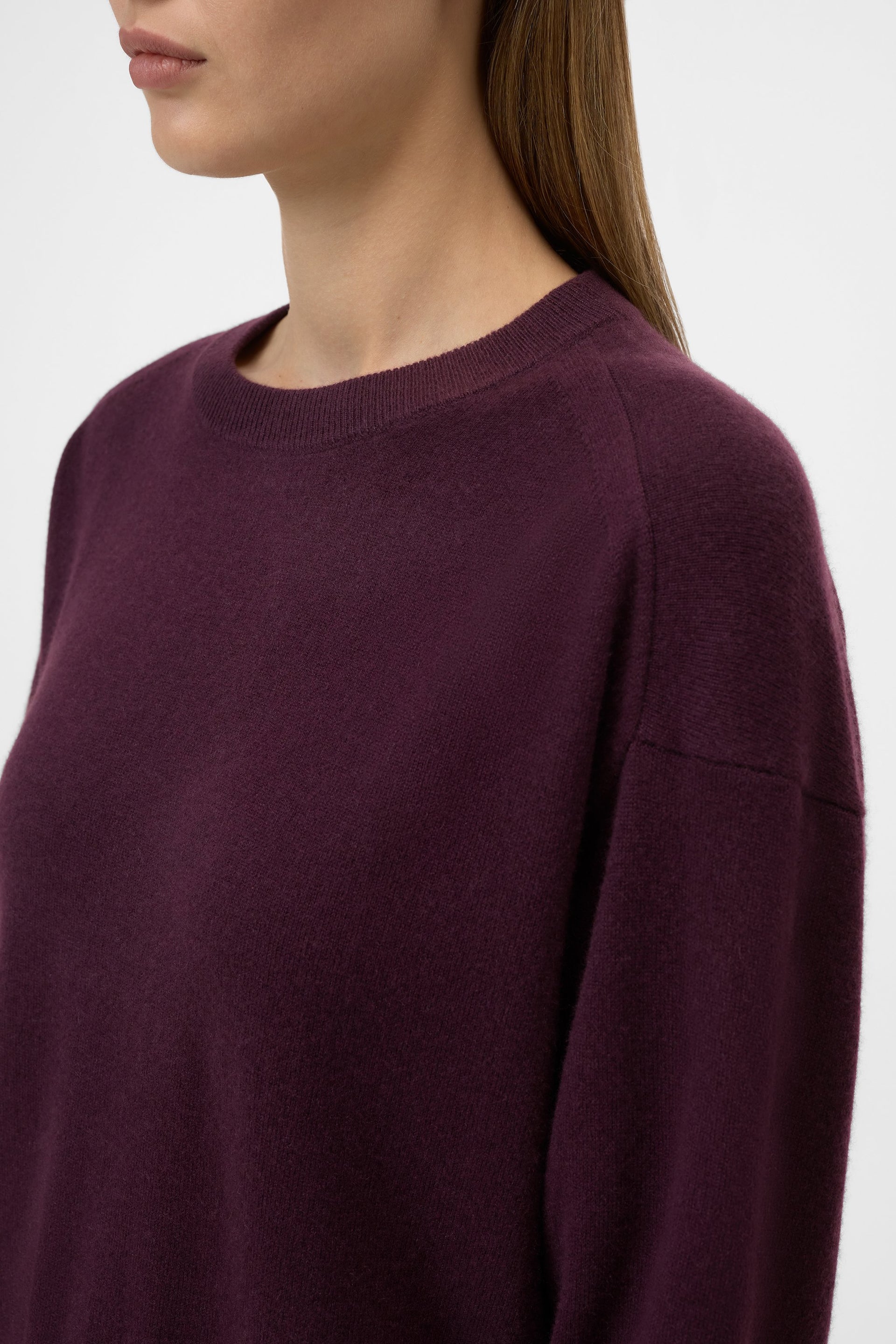 This crew neck sweater made of 100% cashmere highest quality with a fineness of 15.5 to 15.8 microns has a regular fit and a boxy cut. His design features include forward offset shoulder seams, a special seam construction and side slits at the hem.