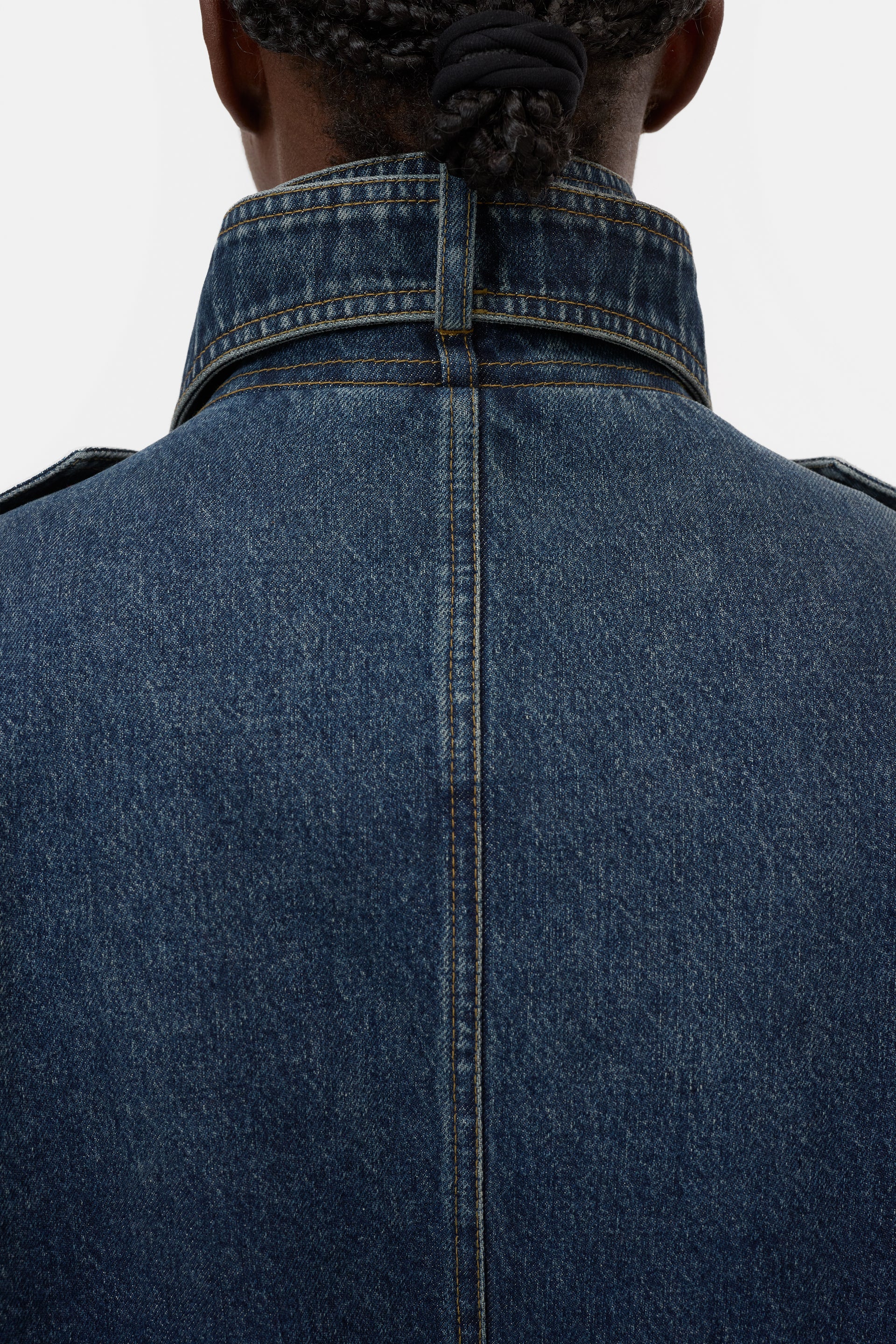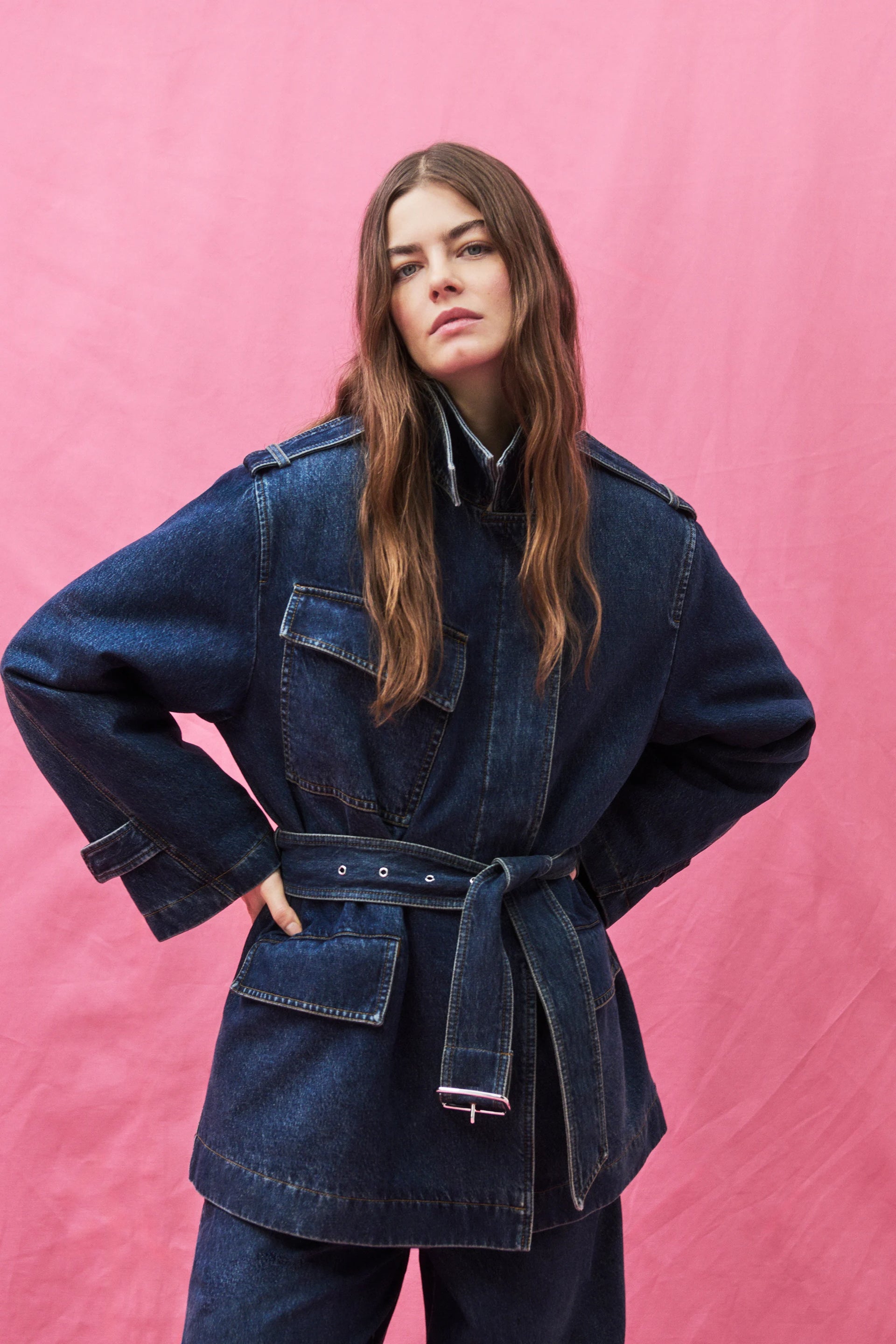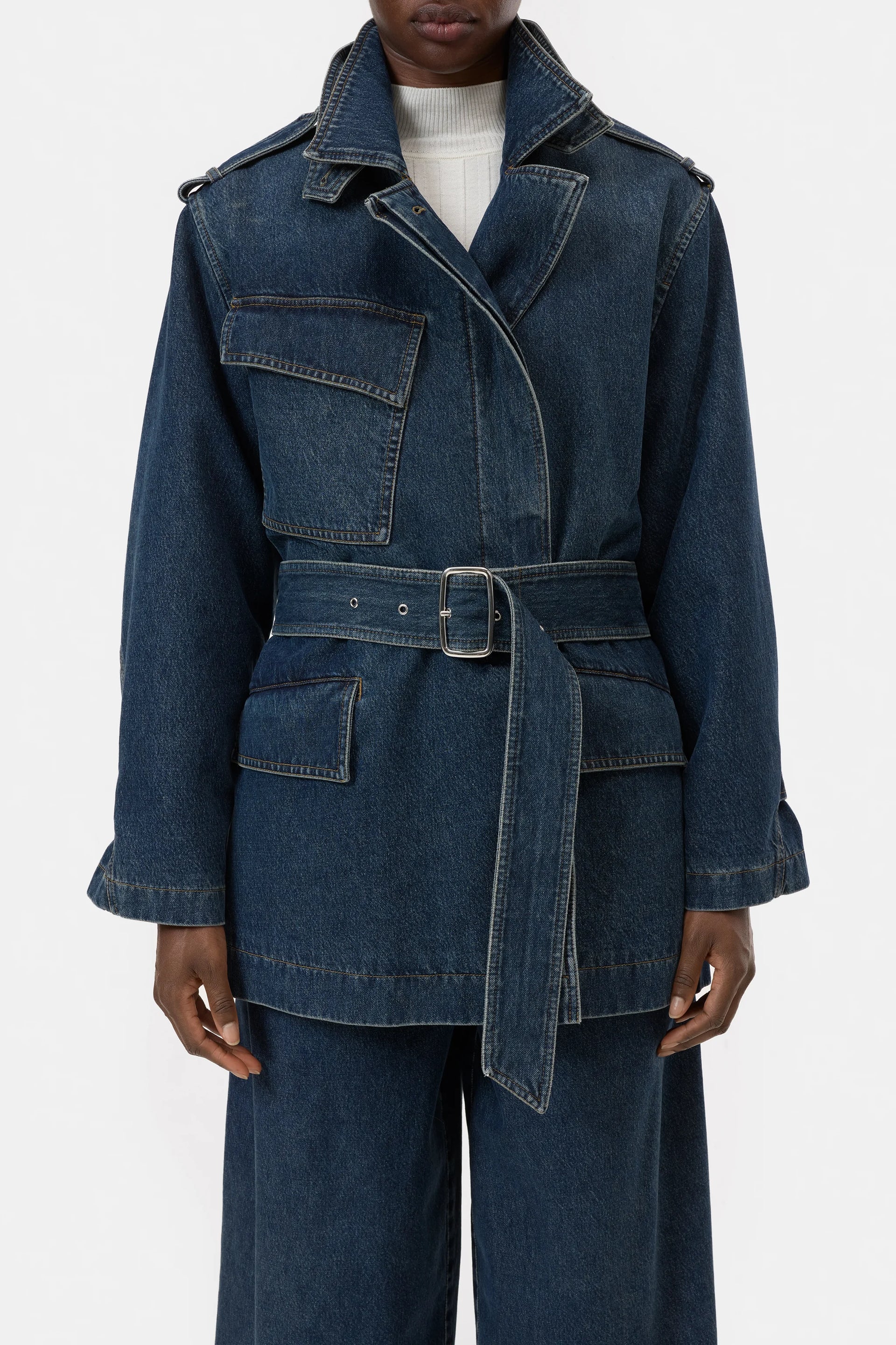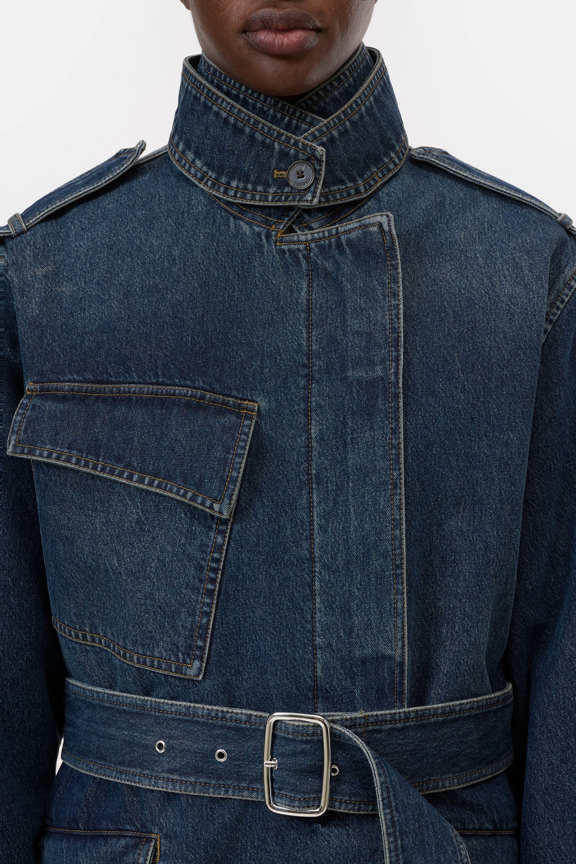 Our trench coat is made of soft denim, which falls particularly beautifully thanks to its organic cotton-lyocell blend. It has a regular fit and a shortened length. With slanted chest pocket, concealed button closure, wide belt with silver buckle and collar flap that can be closed completely.