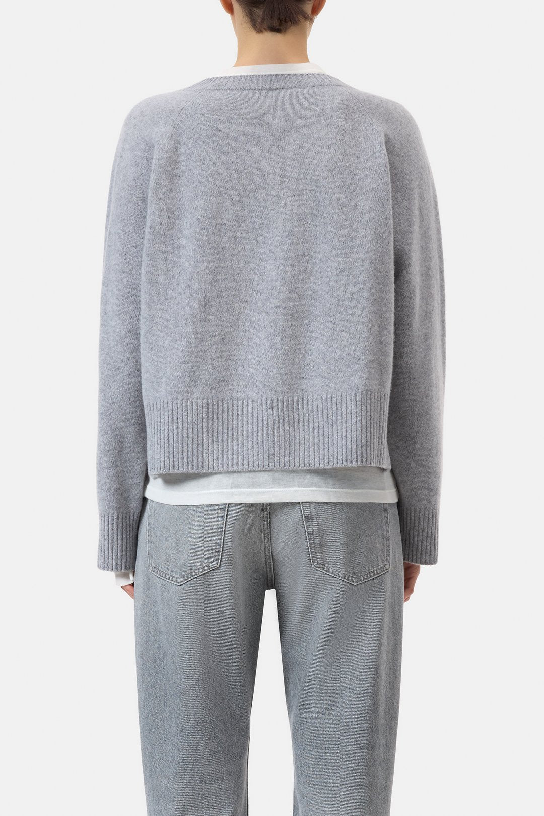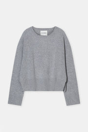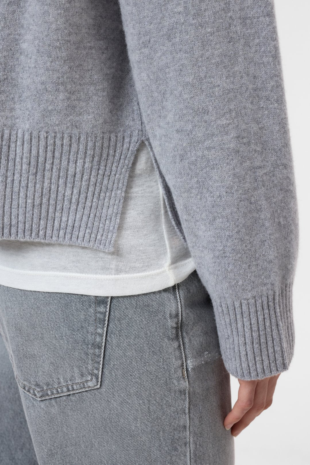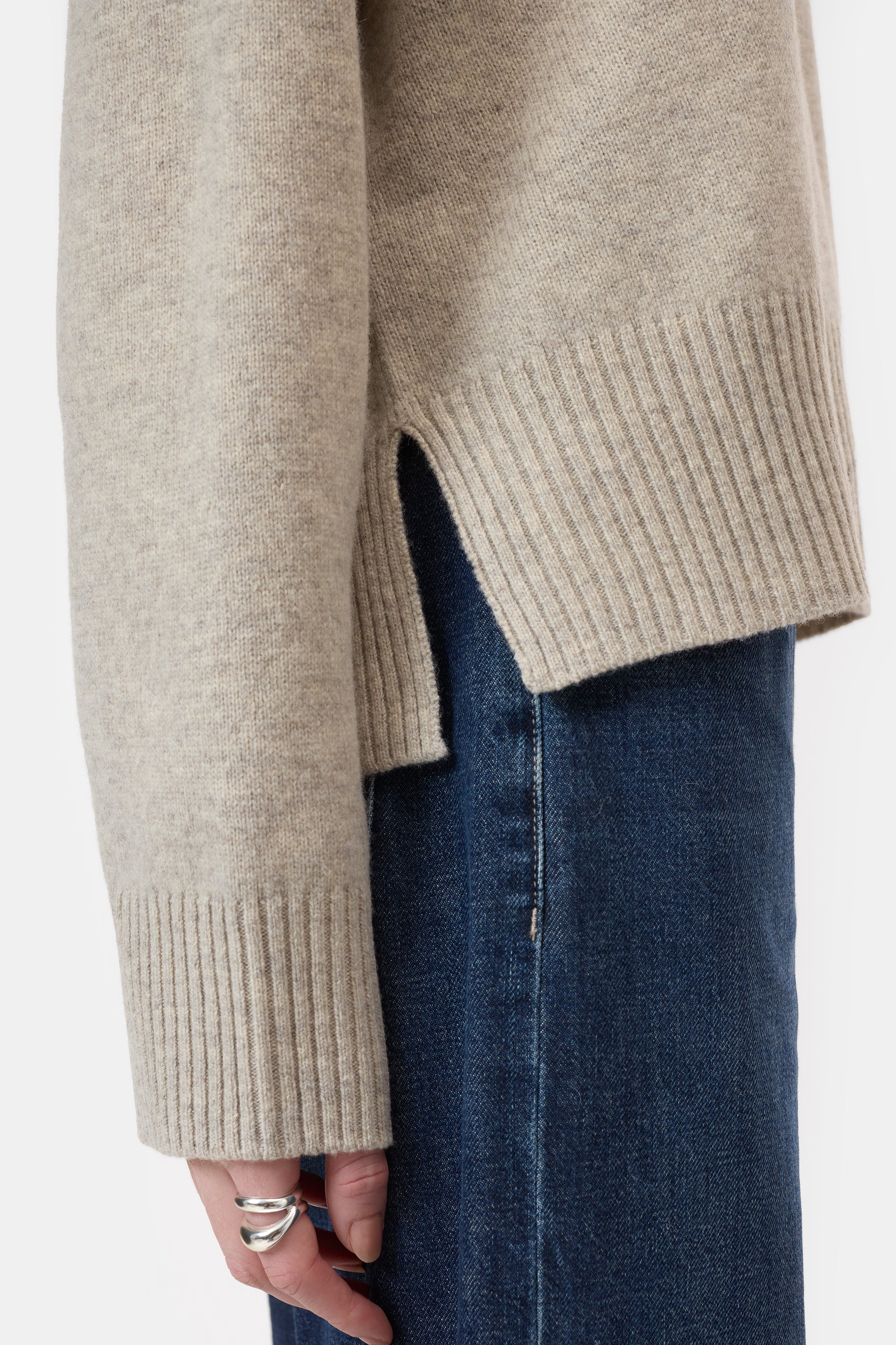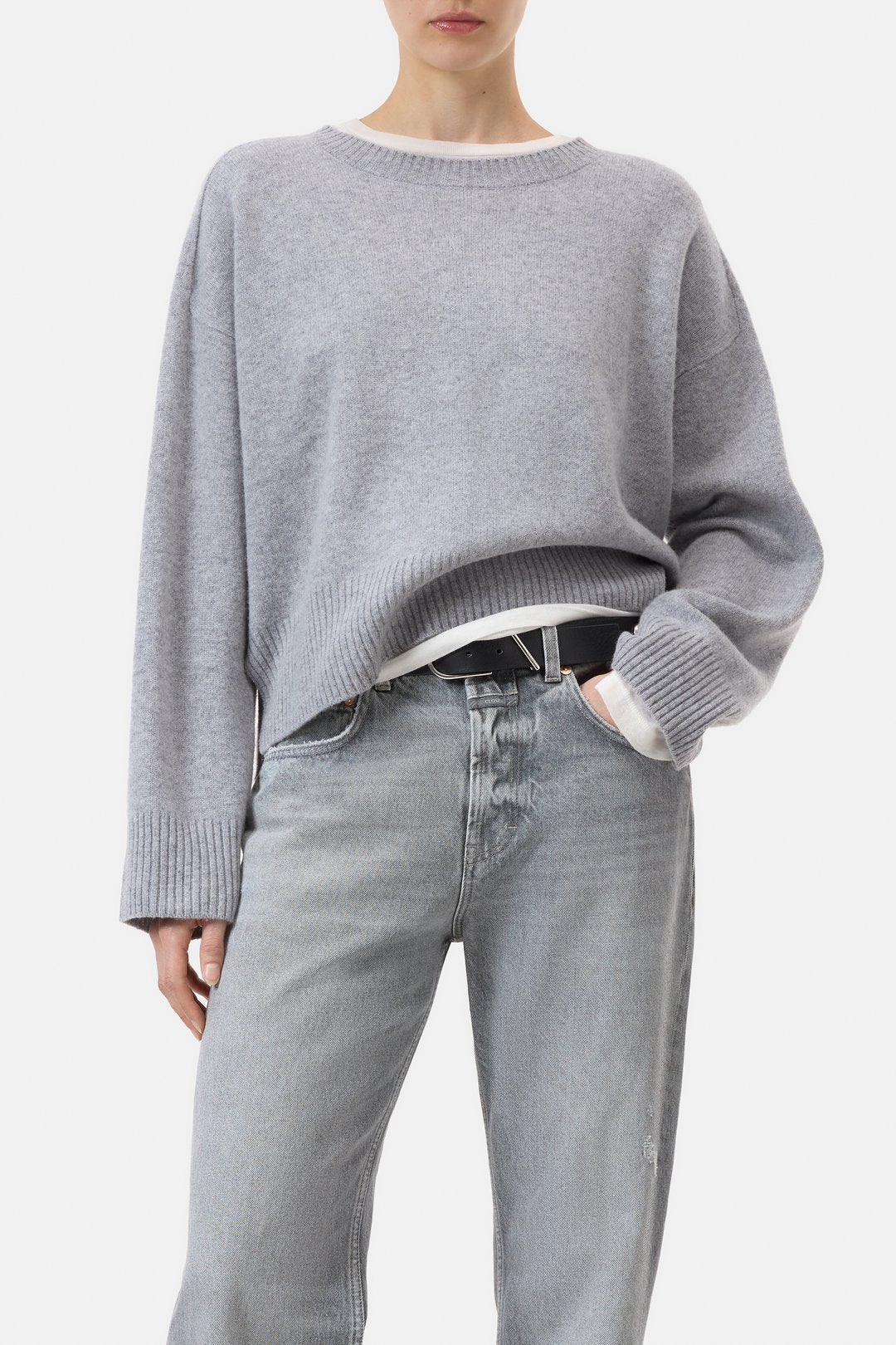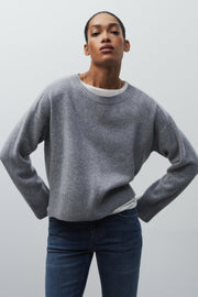 Round neck sweater with wide sleeves in merino wool with a light overwash effect. Regular fit with saddle sleeves, side slits in the hem and innovative knit stitches.