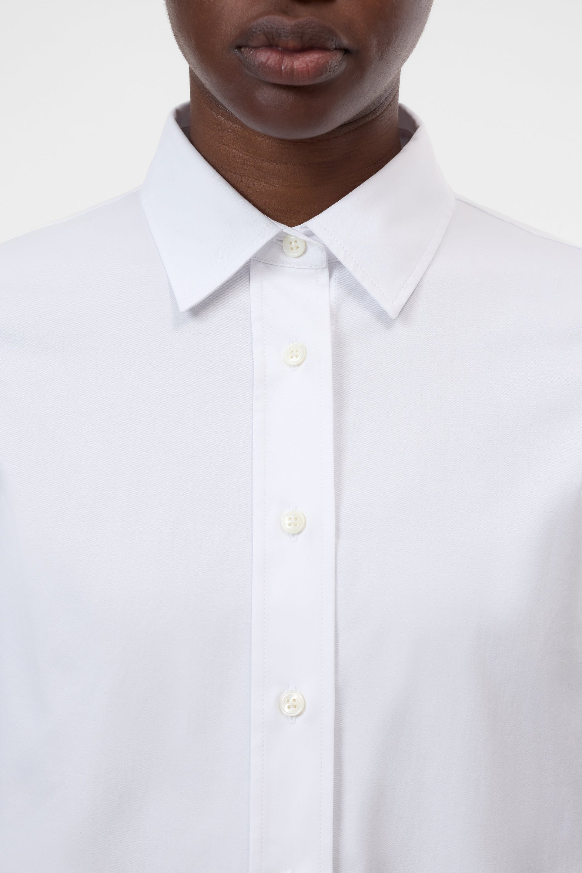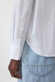 Our regular fit shirt blouse is made of sturdy organic cotton poplin, whose structure is reminiscent of paper. With pointed collar, mother-of-pearl buttons, rounded hem and open back slit with strap detail. Made in Portugal.